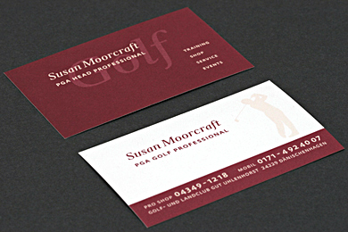 Neben Logo, Visitenkarte, Briefpapier und Aushang, wurden für die Golftrainerin Info-Leporello und Schilder für den Pro-Shop realisiert.